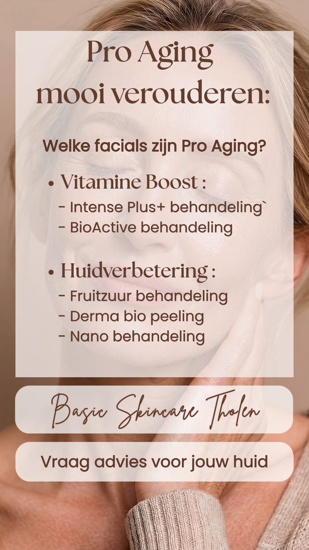 - De Pro aging behandelingen binnen Basic skincare Tholen hebben als doel, op een verantwoorde manier de huid te activeren tot herstel en aanmaak van collageen.